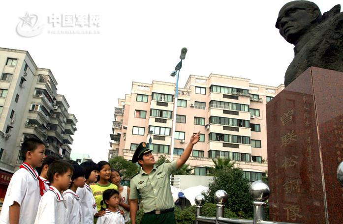 “这位是国旗设计者曾联松爷爷,他就是瑞安人。”“大家知道五星红旗的含义吗?”“大星星是代表中国共产党……”新学期开学没几天,浙江瑞安边防官兵带着10多名东都学校的外来民工子弟学生,首逛瑞安城,来到中华人民共和国国旗设计者曾联松的铜像前,接受爱国主义教育。图为边防官兵在中华人民共和国国旗设计者曾联松的铜像前,给学生讲解国旗知识。 中国军网 蔡宽元 摄 (责编:孙礼)