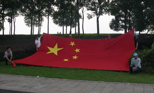 格兰公司自发组织10余名员工前往巡游现场,手持国旗,展示巨型国旗,高呼“生日快日,祖国万岁”(图为格兰公司为祖国母亲的60华诞特制的巨型国旗)