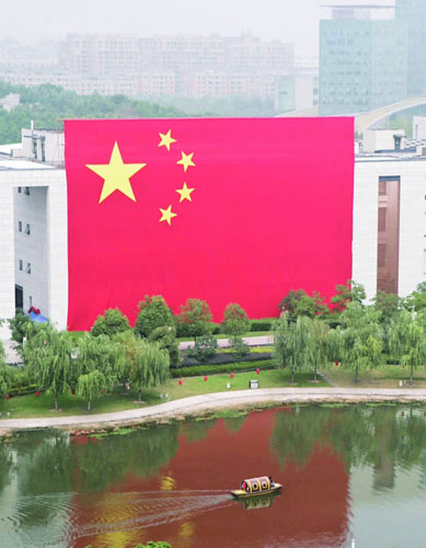 27日上午,和睦塘畔的县图书馆一面巨型国旗格外耀眼。这面长37.95米,宽25.3米,面积为960平方米的国旗,是浙江省目前最大的五星红旗。据悉,该国旗为浙江格兰工贸实业有限公司历时19天制作完成,采用了承重性很强的加密低弹牛津布特制而成,以纪念祖国60华诞。